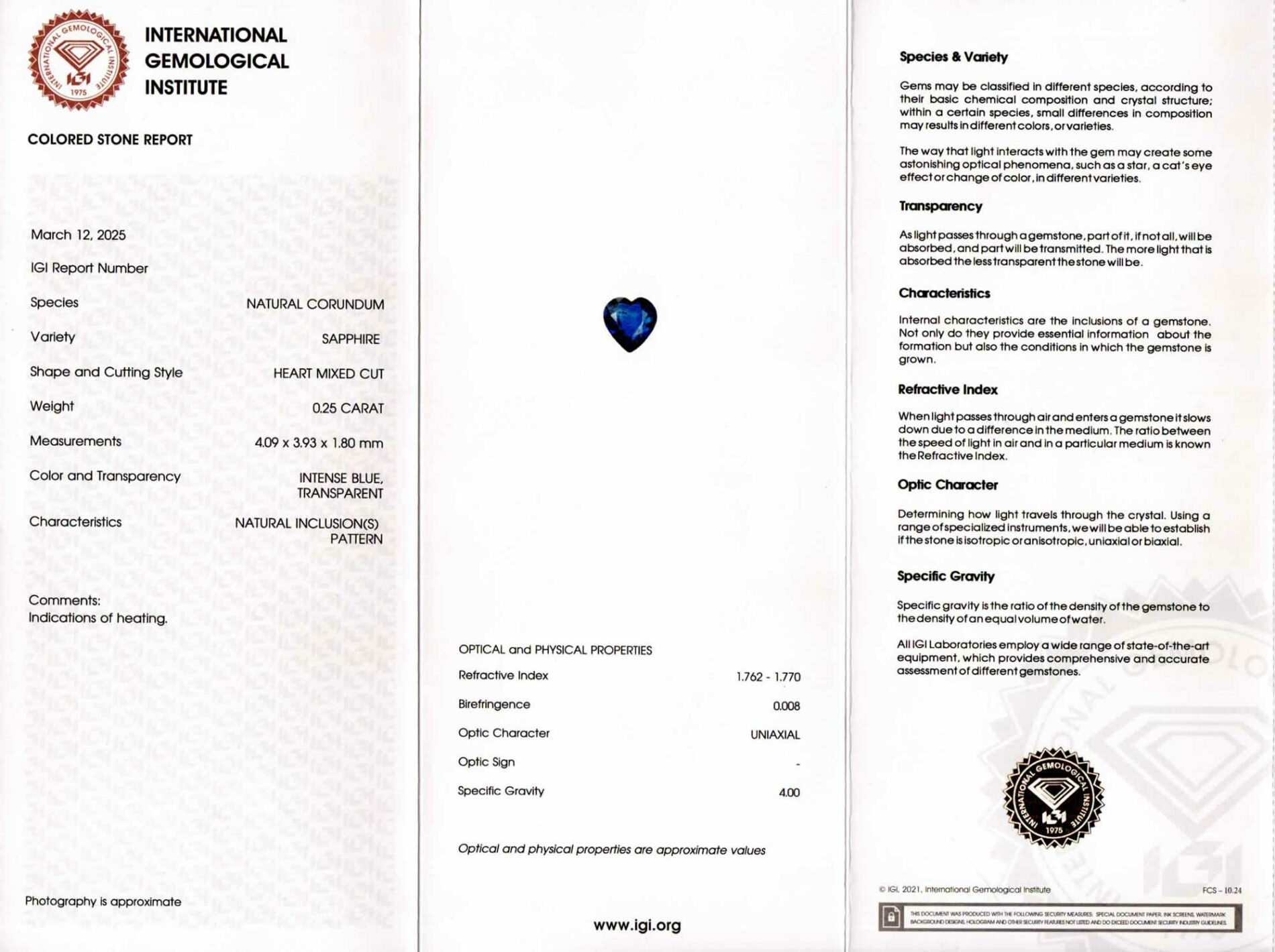 Questo anello è di fatto un gioiello di forma con una gemma taglio cuore. Per la precisione, uno zaffiro certificato dal prestigioso Istituto Internazionale di Gemmologia “IGI – Anversa”. Ed una pietra certificata ha sempre un valore aggiunto, sia per qualità che per caratteristiche.