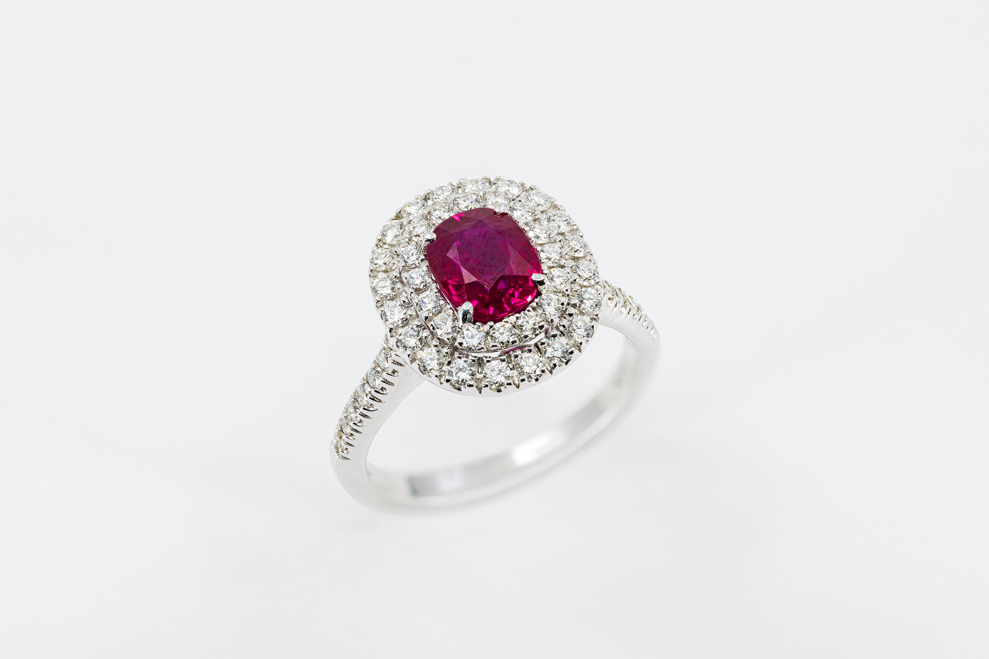 Anello double halo rubino Prestige – Un gioiello moderno e dinamico