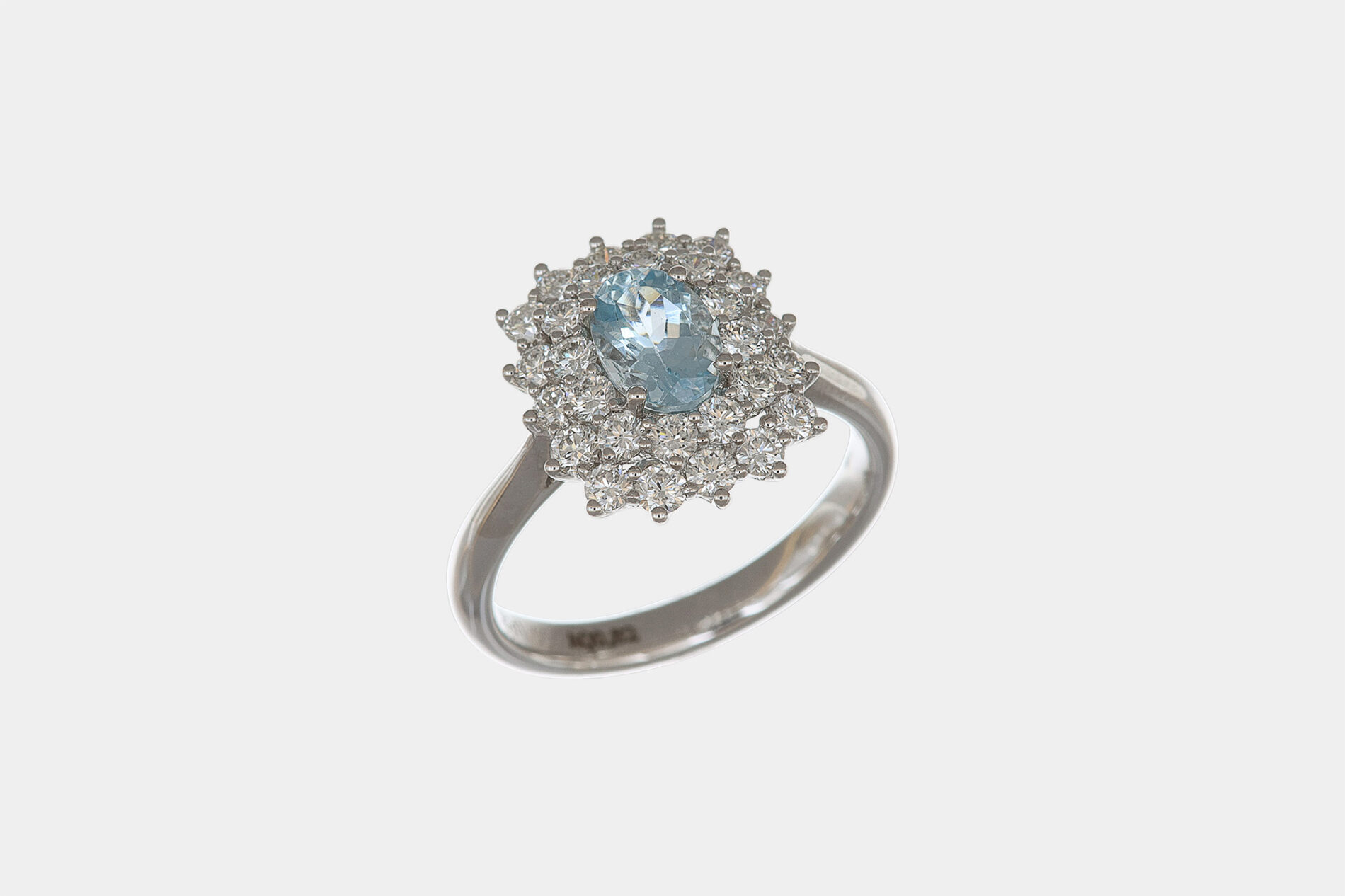 Questo anello è di fatto un gioiello di forma che si sviluppa appunto da una acquamarina taglio “ovale”. Selezionata per le sue caratteristiche univoche, la pietra emette una tenue ed incantevole tonalità di azzurro che ben si sposa con la luminosità delle altre gemme.