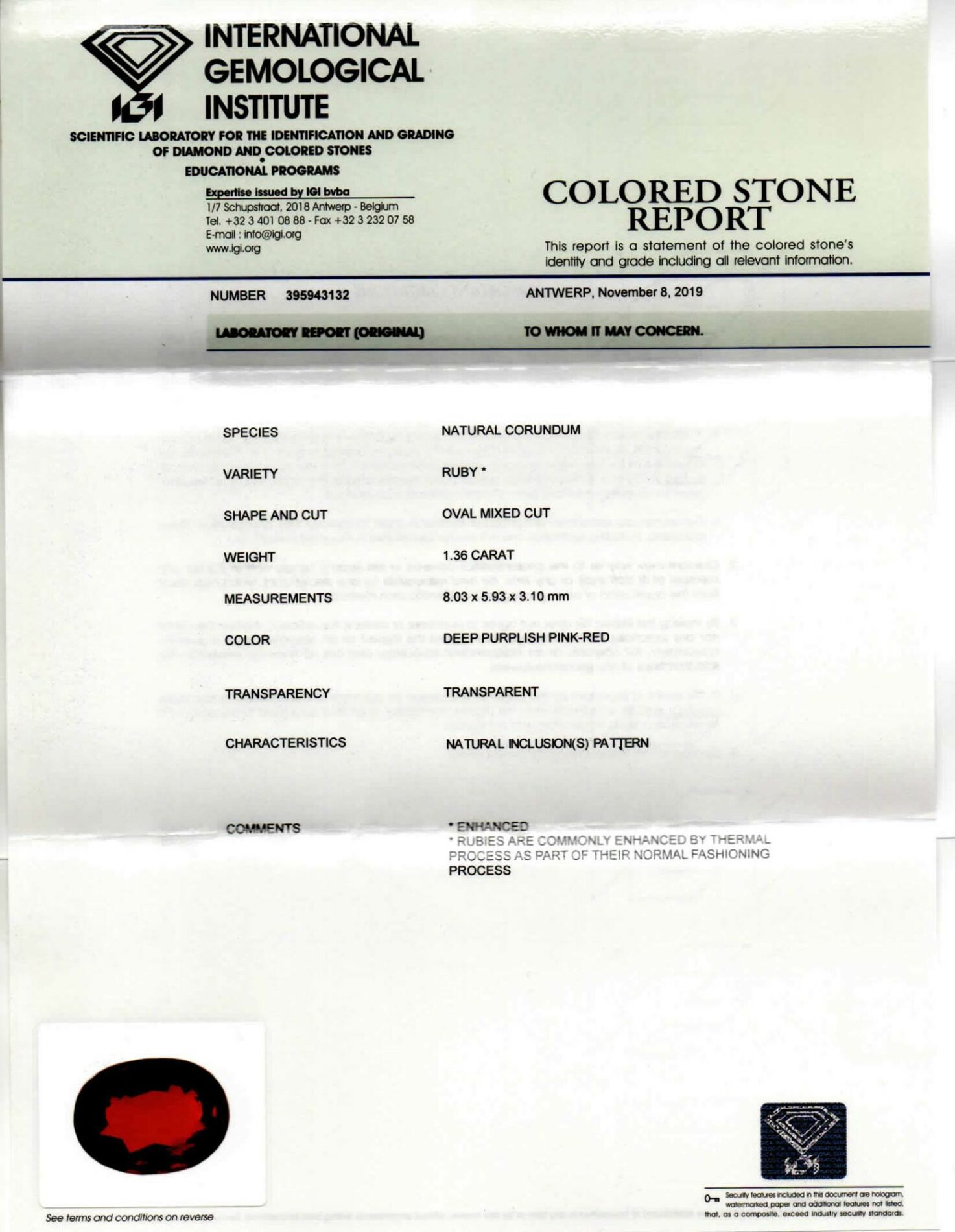 • Il rubino taglio “ovale” è certificato dall’Istituto Internazionale di Gemmologia “GFCO”