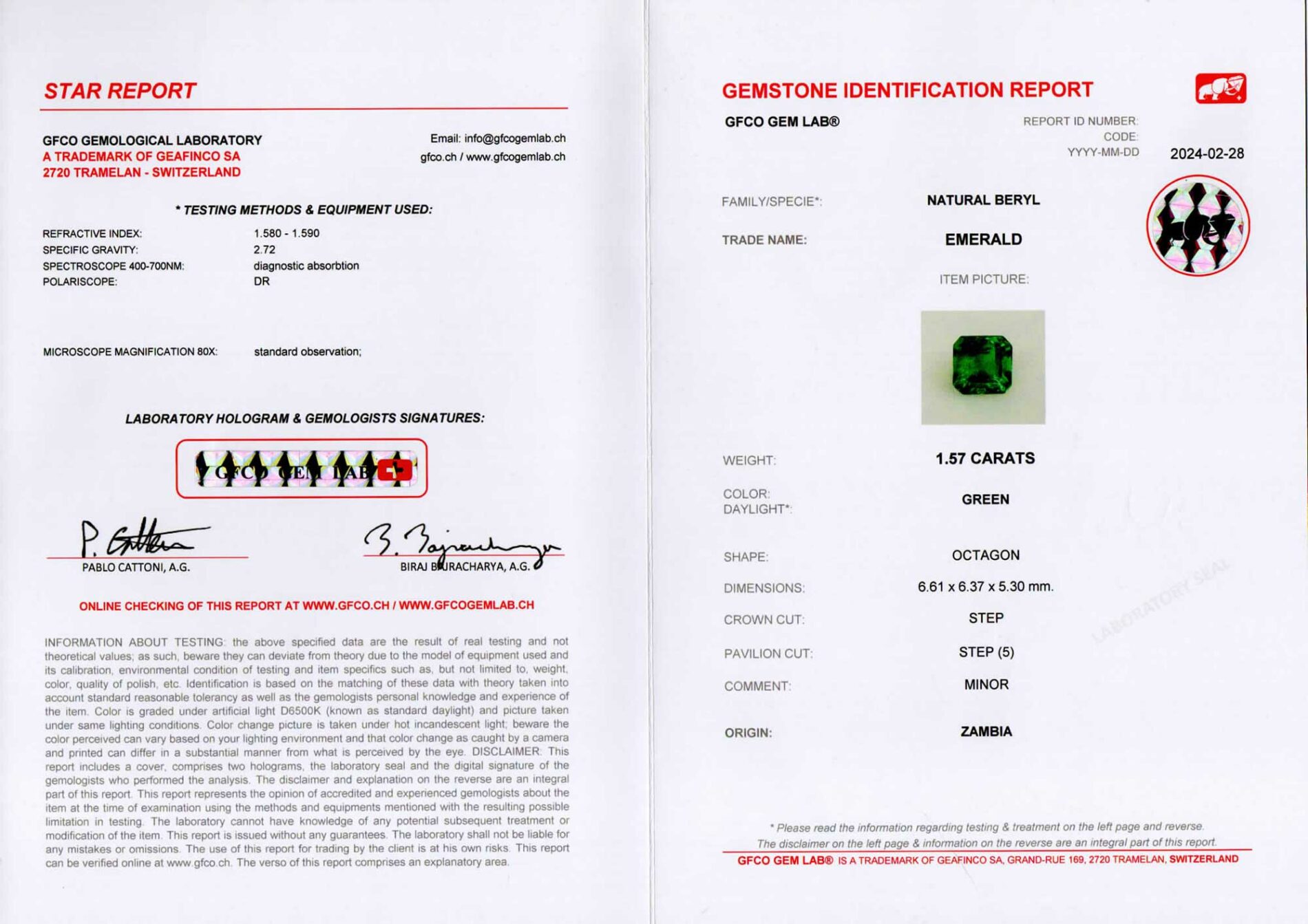 • Lo smeraldo di provenienza “Zambia” sviluppa una caratura di 1.57 ct. ed è provvisto di certificato del laboratorio di gemmologia “GFCO”.