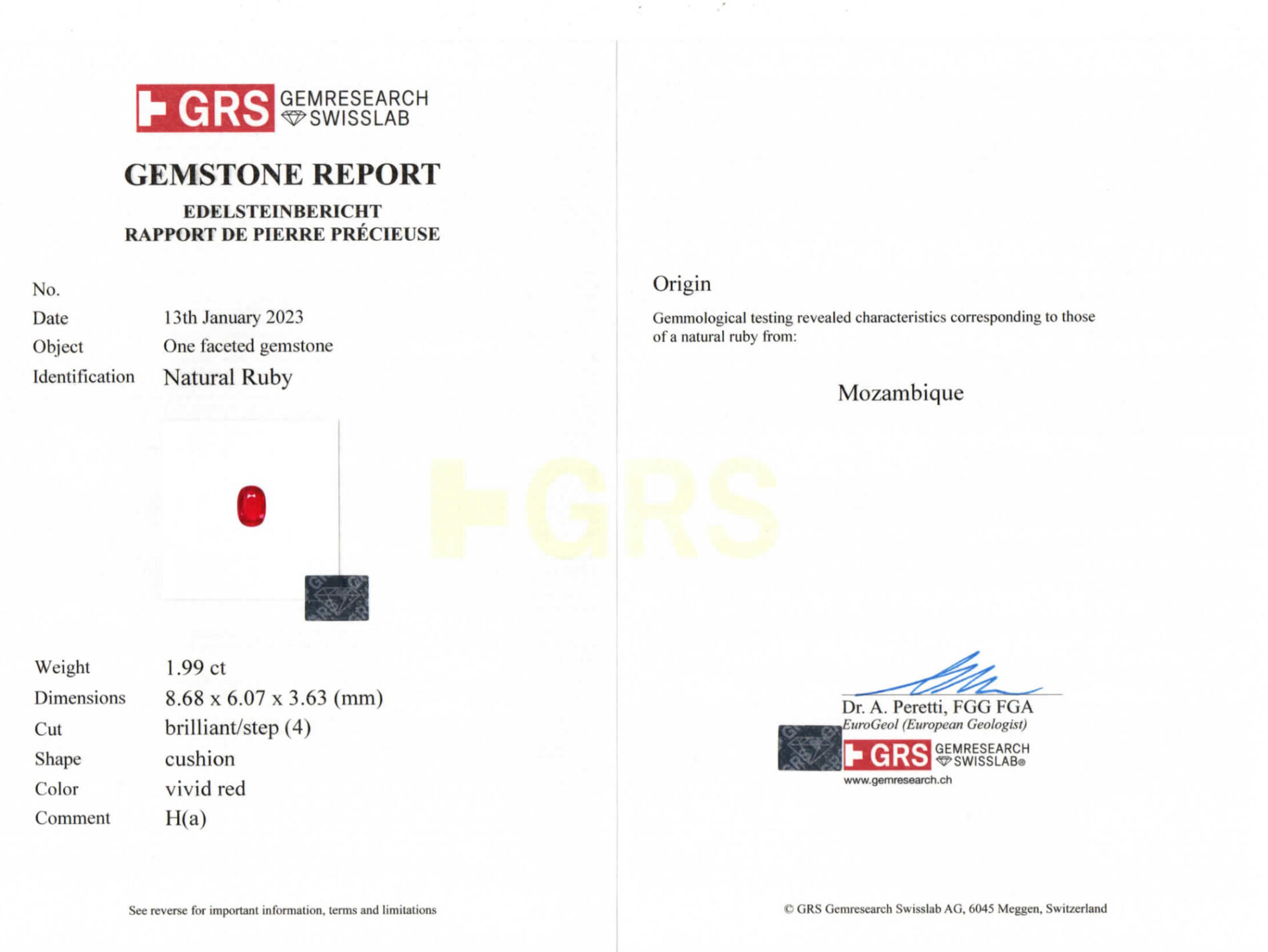 • Il rubino sviluppa una caratura totale di 1.99 ct.