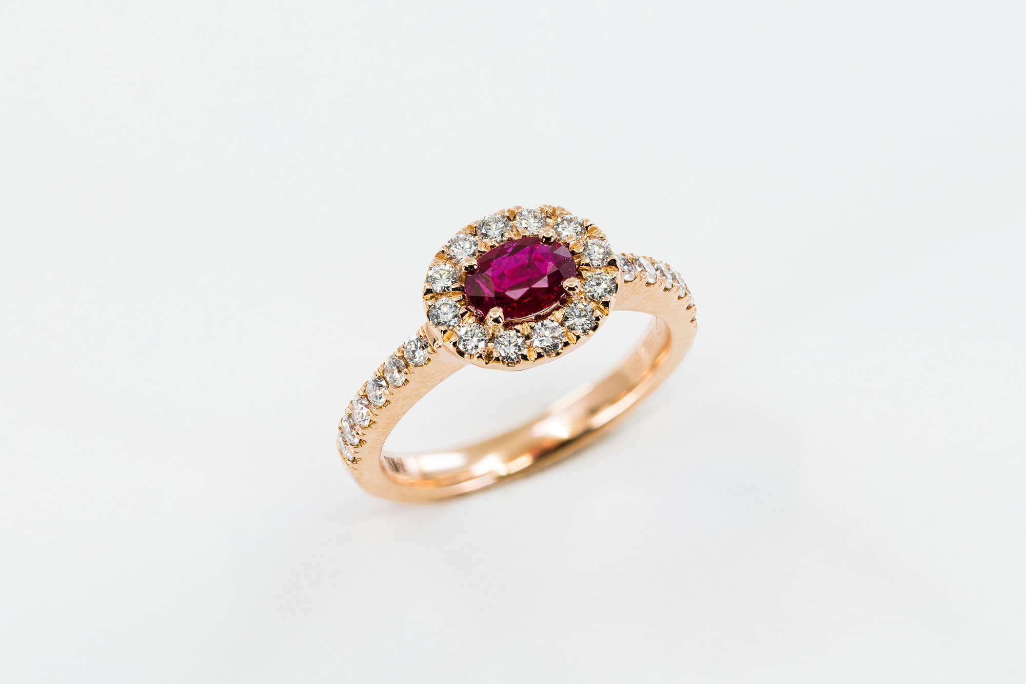 La montatura, realizzata interamente in oro rosa 18 carati, esalta la bellezza della gemma. Il rubino è al centro, e tutt’attorno vi è un meraviglioso pavé di diamanti taglio tondo brillante che arriva fino al gambo della montatura. Una scintillante e preziosa decorazione.
