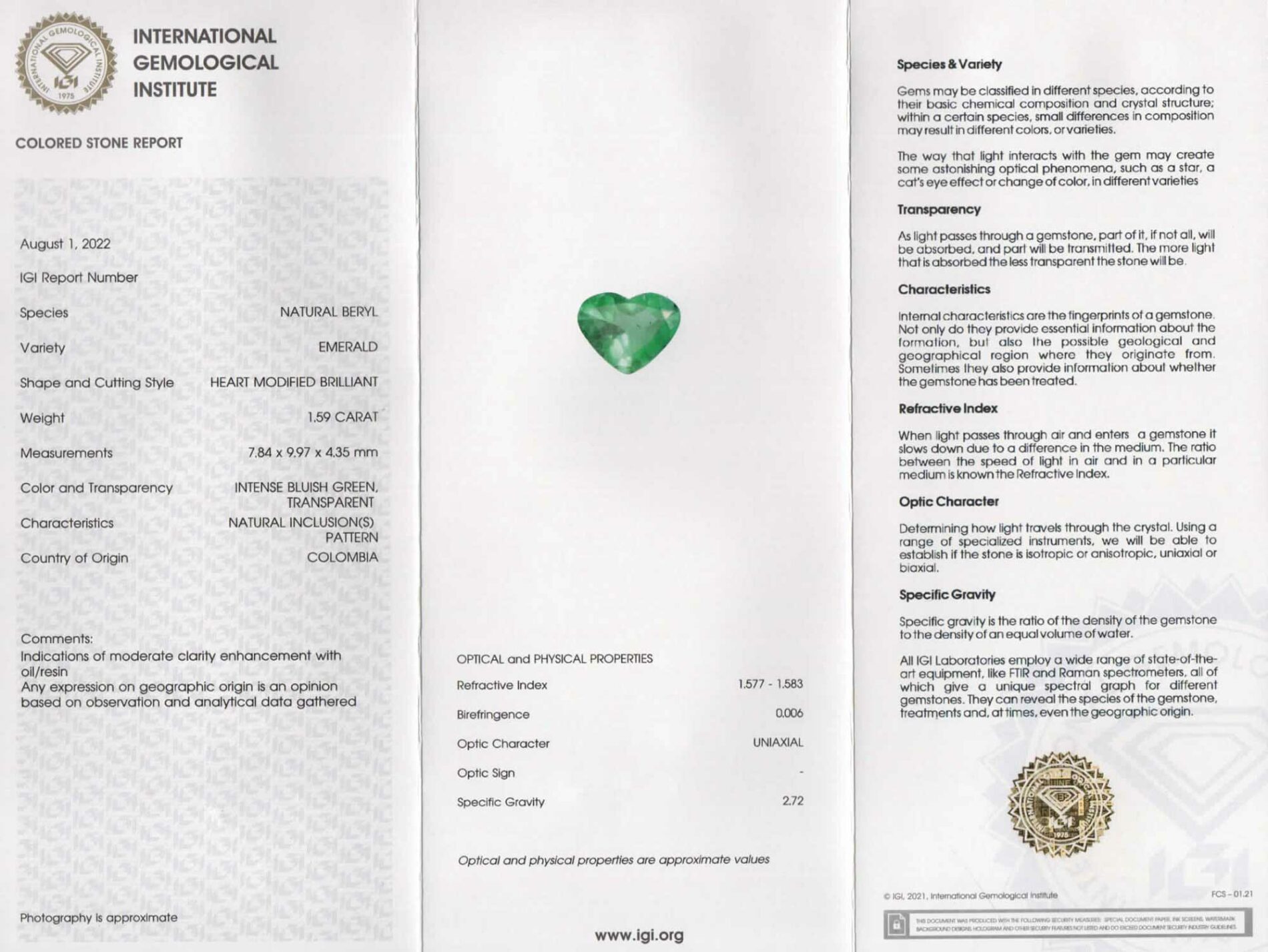 Questo anello con pietra taglio cuore è di fatto un gioiello di forma con una gemma taglio cuore. Per la precisione, uno smeraldo colombiano certificato dall’Istituto Internazionale di Gemmologia “IGI” di Anversa. Quindi una gemma che è stata esaminata da alcuni tra i più importanti gemmologi al mondo.