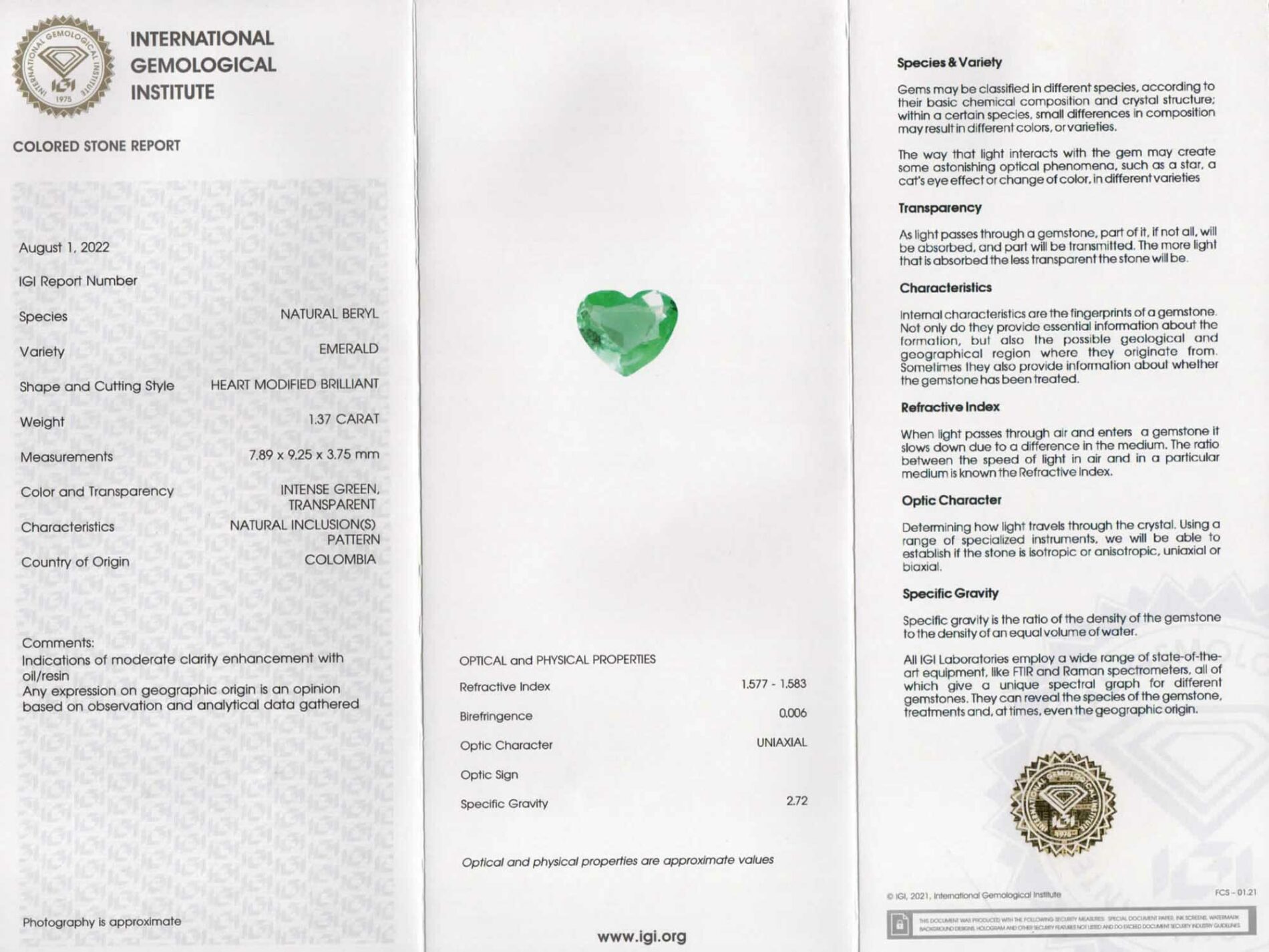Questo anello con pietra taglio cuore è di fatto un gioiello di forma con una gemma taglio cuore. Per la precisione, uno smeraldo colombiano certificato dall’Istituto Internazionale di Gemmologia “IGI” di Anversa. Quindi una gemma che è stata esaminata da alcuni tra i più importanti gemmologi al mondo.