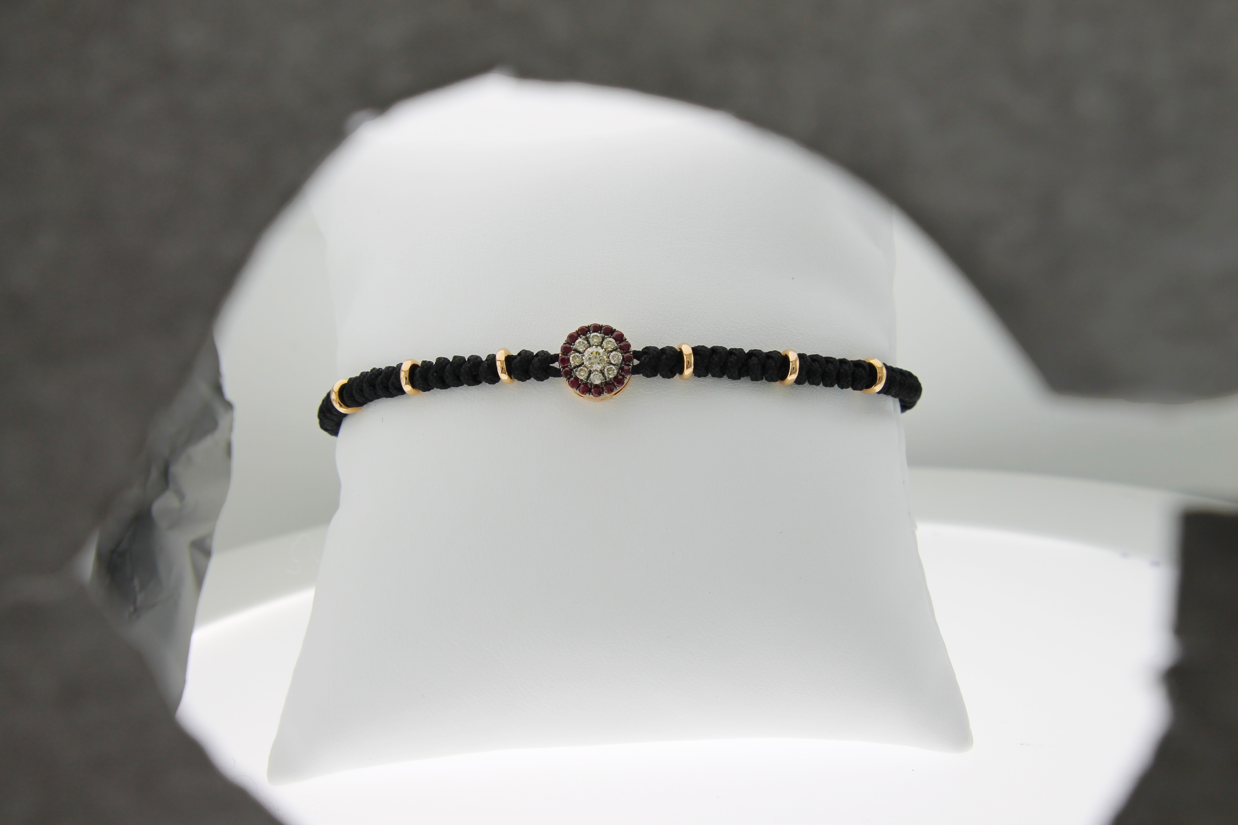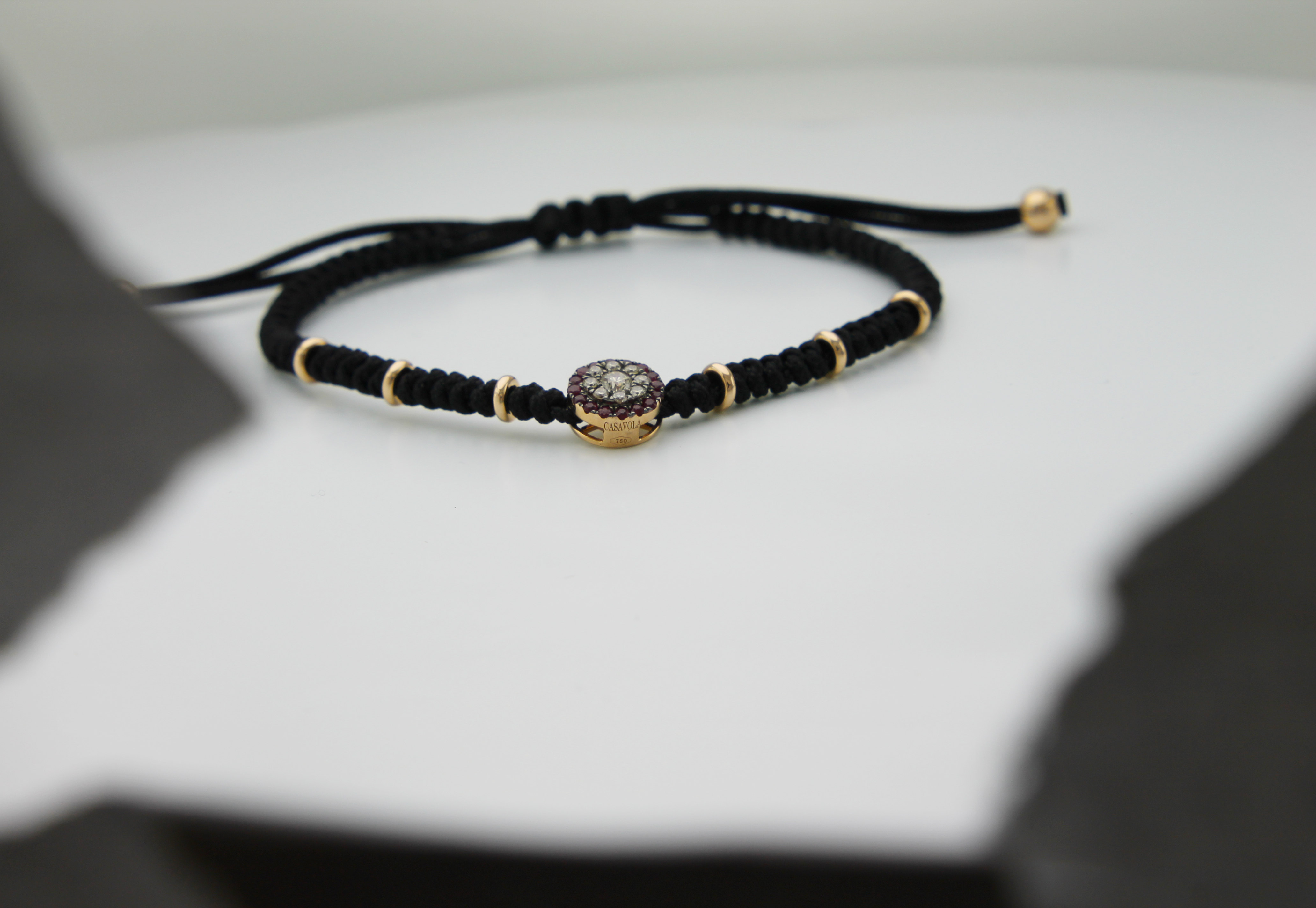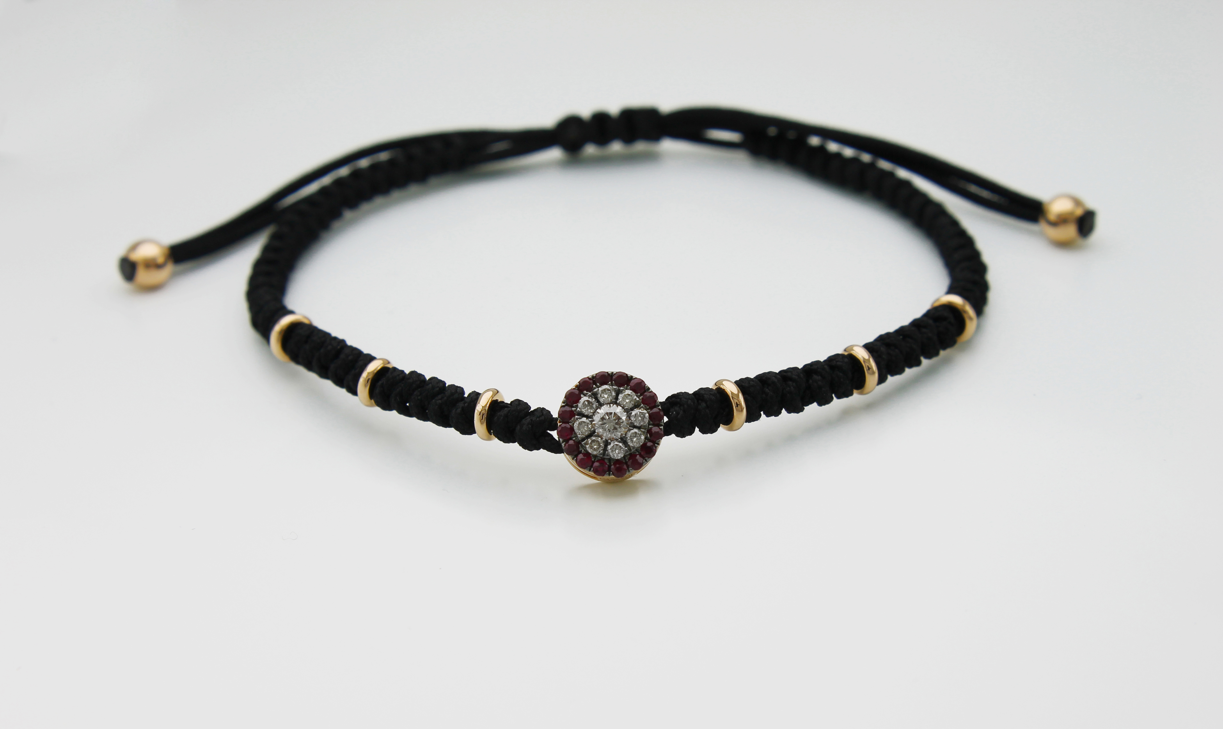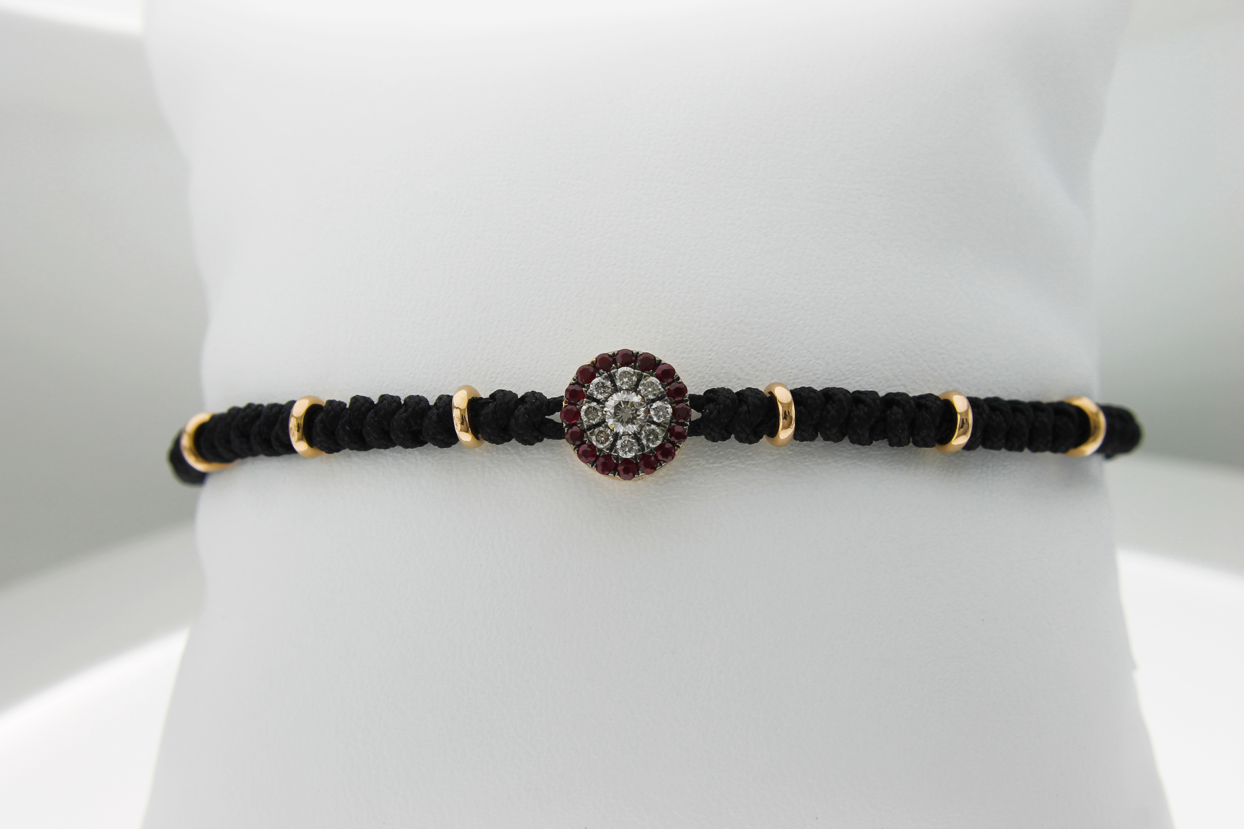 Il tessuto nero intrecciato da cui è composto gran parte del bracciale è intramezzato dagli elementi in oro rosa e, proprio sulla chiusura, si trovano altri due elementi (sempre in oro rosa) che ridefiniscono il tutto. Il bracciale è regolabile tramite nodo scorsoio, ed ha una misura massima di 18 cm.
