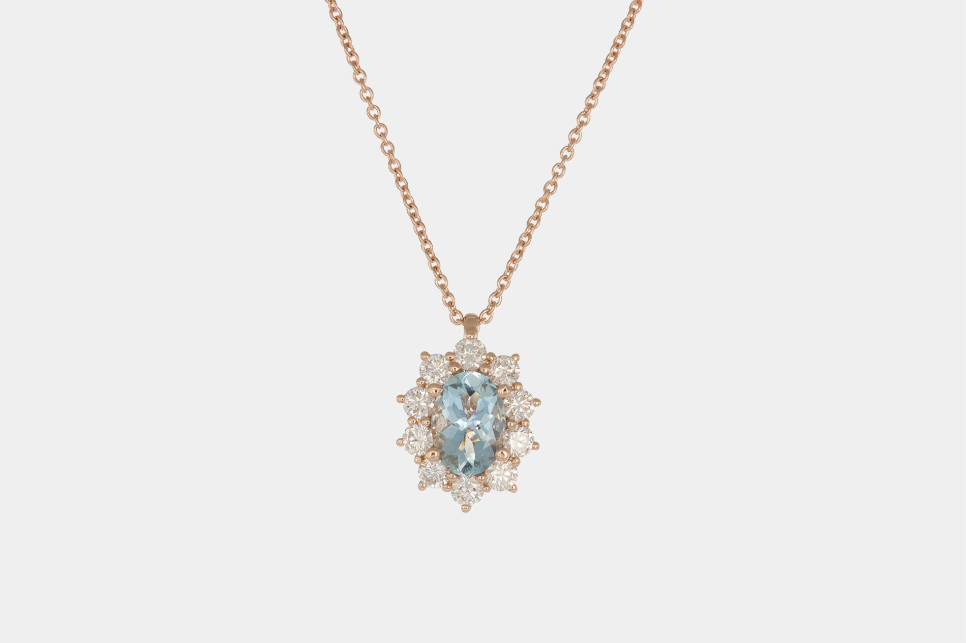 Collana pendente Sunflower in oro rosa con acquamarina e diamanti della collezione Nature by Gioielleria Casavola di Noci (BA).