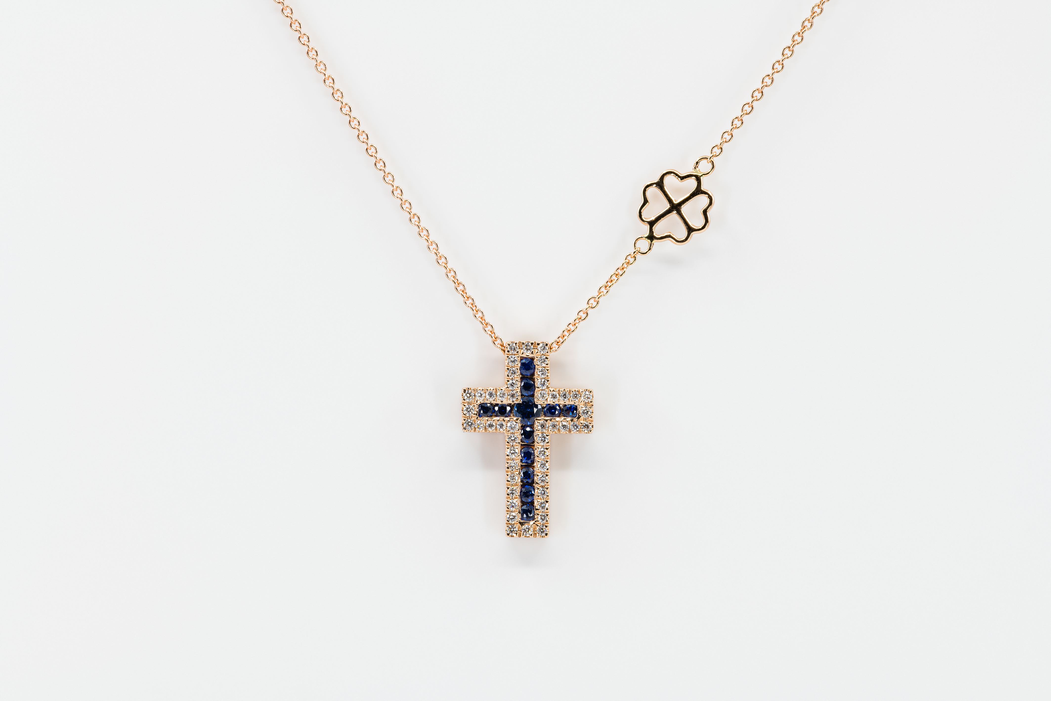Collana croce Grand Angelus zaffiri rosè è una delle creazioni più innovative della Gioielleria Casavola di Noci (BA). Una collana in oro dal design unico ed inconfondibile.