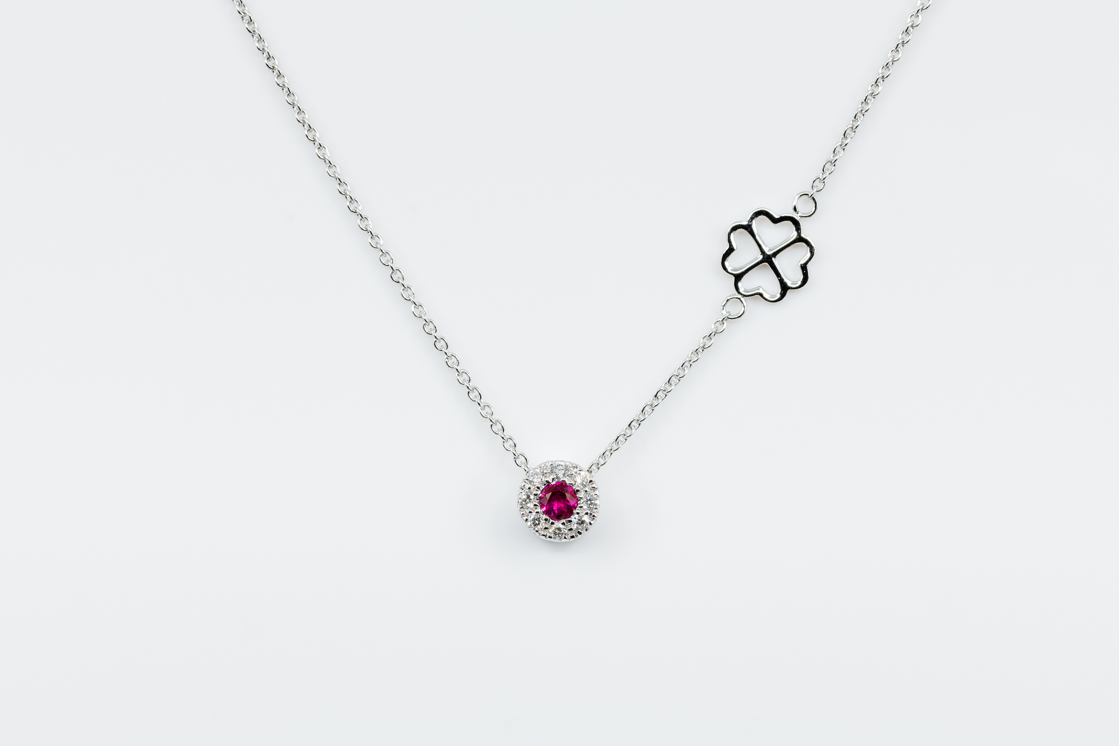 Collana Invisible Petite Rubis è uno dei gioielli più innovativi e colorati della Gioielleria Casavola di Noci (BA). Una deliziosa collana in oro bianco e diamanti con al centro un piccolo rubino rosso. Una colorata variazione sul tema “invisible”.