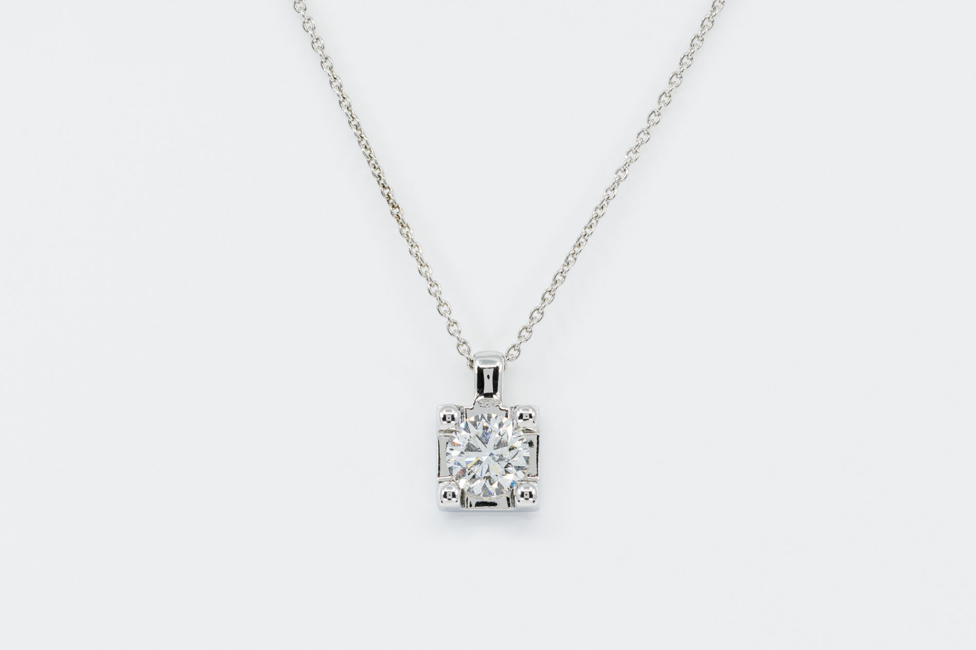 Collana punto luce diamante griffe quadro White è un gioiello femminile molto affascinante. Una delicatissima collana su cui spicca un diamante taglio “tondo brillante” su montatura in oro bianco detta appunto “a griffe quadro”. Una idea regalo semplice, essenziale ma molto luminosa realizzata dalla Gioielleria Casavola di Noci (BA).