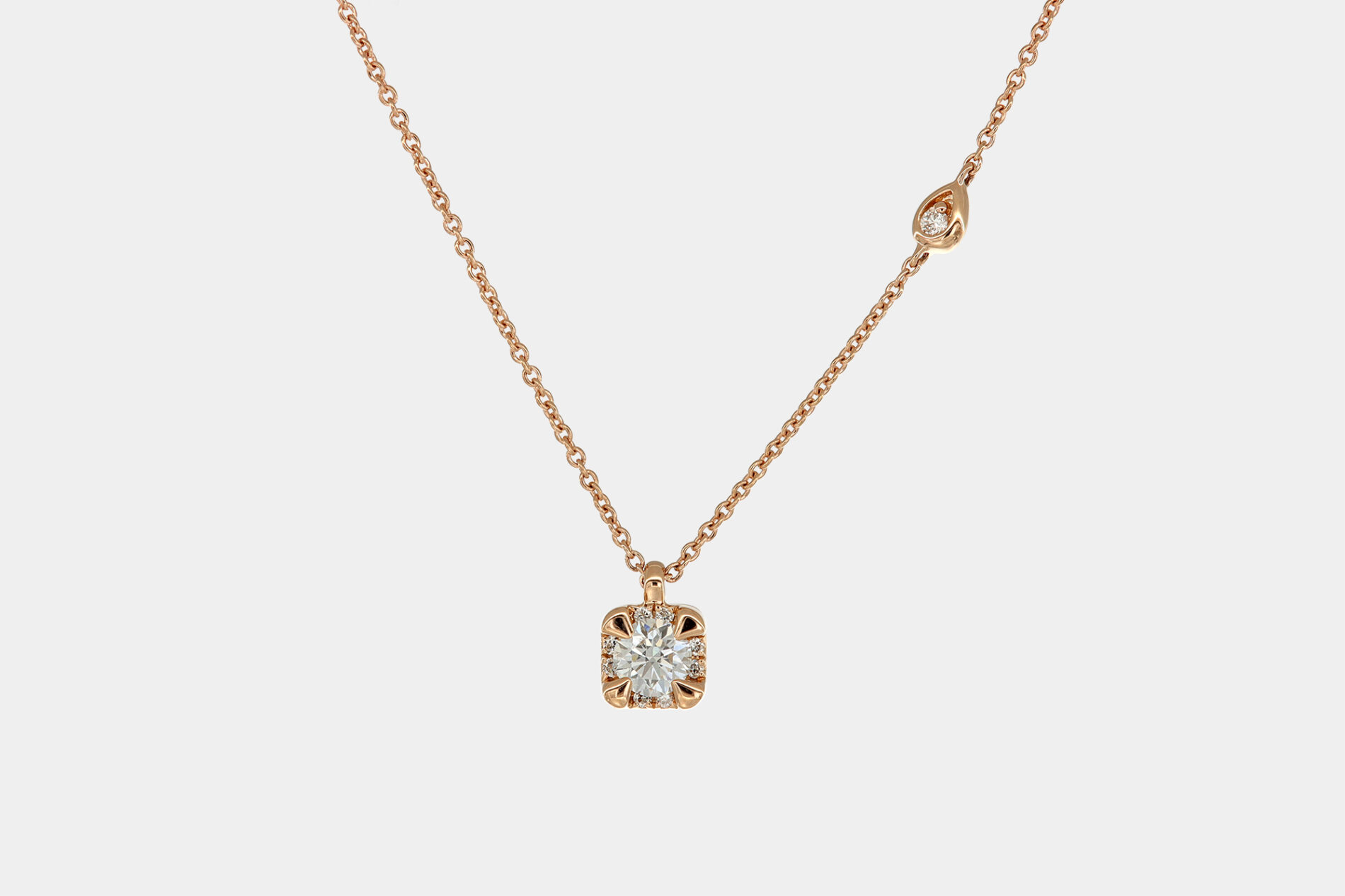 Collana punto luce diamante Mirror Rose è un gioiello femminile molto affascinante. Una delicatissima collana su cui spicca un diamante taglio “tondo brillante” su montatura in oro rosa di forma quadrata detta “a quattro griffe”. Ma c’è di più: sul pendente sono “nascosti” otto piccoli diamanti taglio “tondo brillante” proprio ai lati esterni della suddetta montatura! Una idea regalo lussureggiante e molto luminosa realizzata dalla Gioielleria Casavola di Noci (BA).