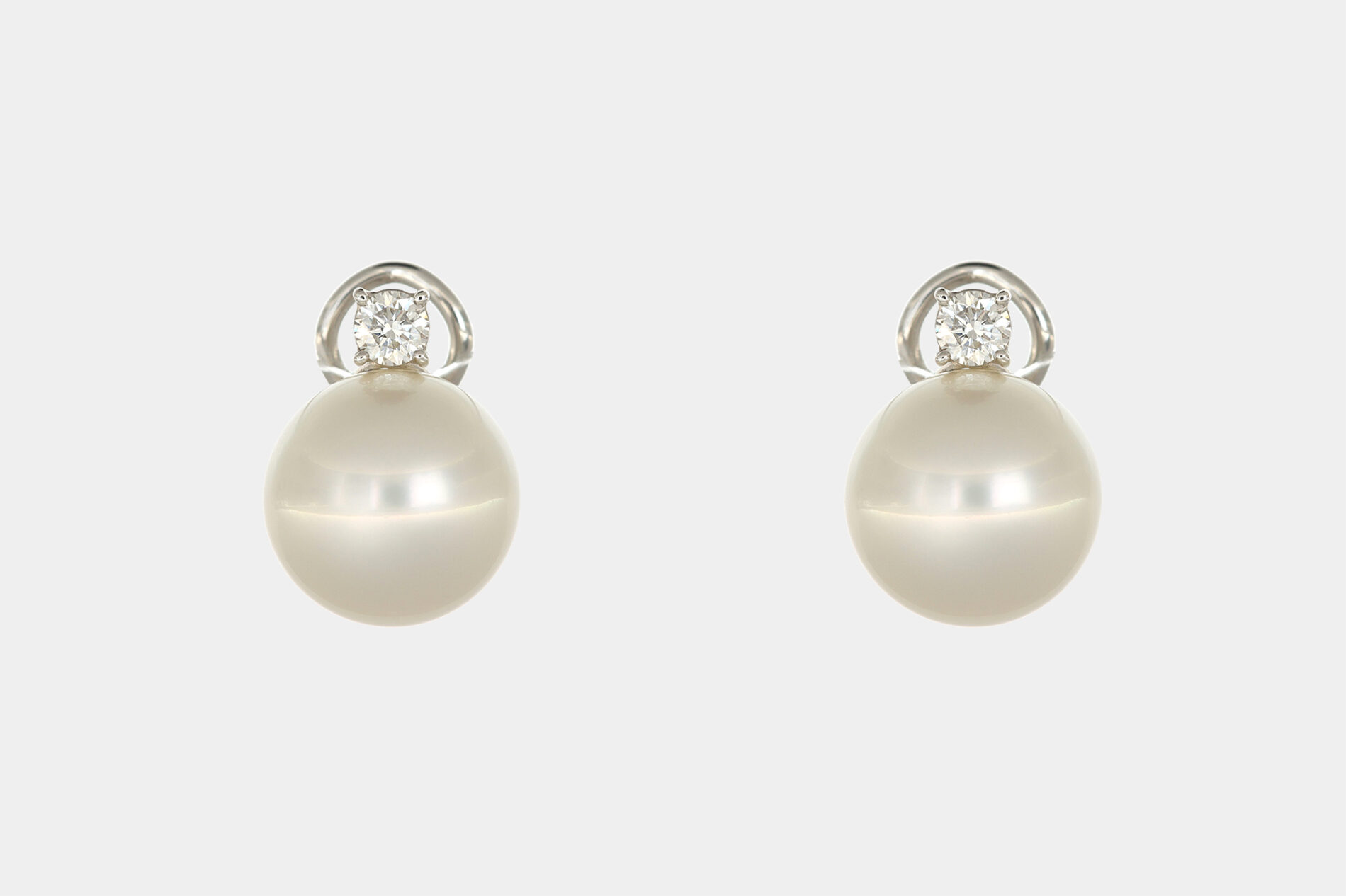 Grande attenzione è stata riposta nella scelta dei diamanti inseriti su ognuno di questi orecchini. Come potete notare, su ogni singolo orecchino è posizionato appunto un diamante taglio “tondo brillante”, selezionato per dare più luce alla perla. La montatura in oro bianco “sorregge” il tutto, ed è integrata nella chiusura detta “a monachella”. Quindi il gioiello sarà molto portabile e leggero.