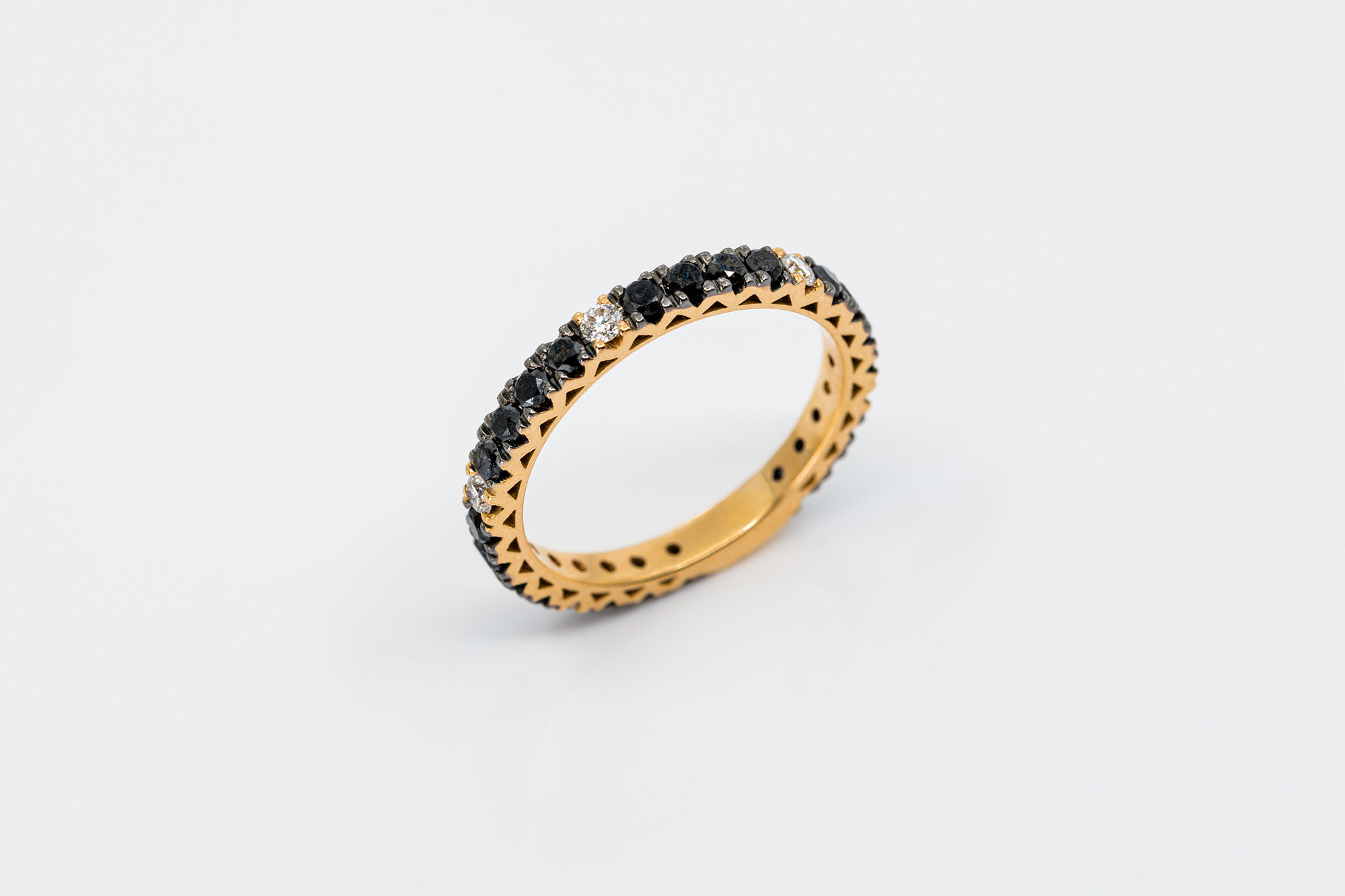Anello girodito da uomo con diamanti neri e diamanti bianchi della collezione Infinity modello rosé in oro rosa realizzato dalla Gioielleria Casavola di Noci (BA).