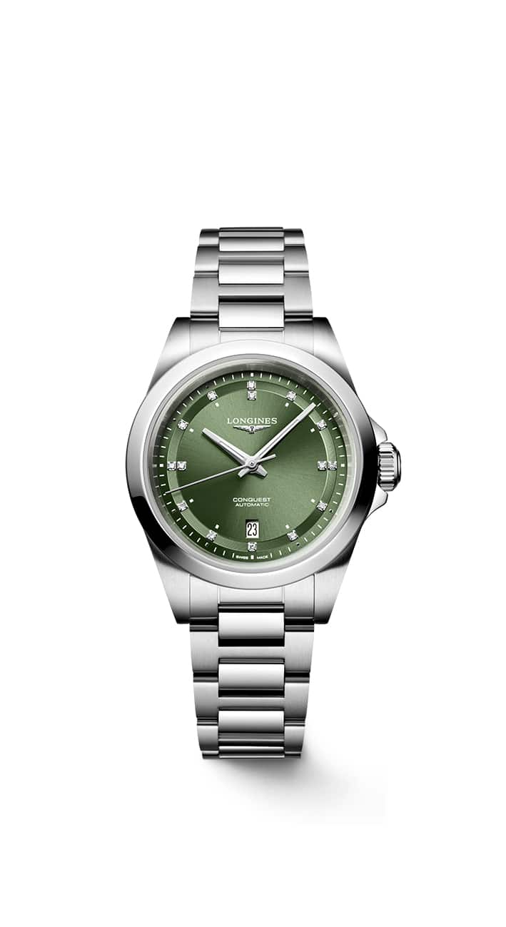Longines Conquest L3.320.4.07.6 è un orologio automatico da donna che riesce a sintetizzare perfettamente prestazioni ed eleganza. Ed è molto apprezzato per la sua qualità costruttiva, per il diametro di soli 30 mm e per la scelta di inserire sul quadrante color verde effetto “Sunray” degli splendidi diamanti come indici.