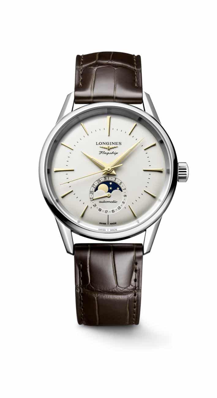 Longines Flagship Heritage L4.815.4.78.2 è un orologio automatico da uomo che ripesca quelle che erano le linee storiche dei segnatempo di una volta. Un classico dell’orologeria riconosciuto per la sua qualità costruttiva, per il diametro “comodo” ed adatto a tutti i polsi e per l’affidabilissimo calibro “L899” con funzione “fasi lunari” ad ore “6”.