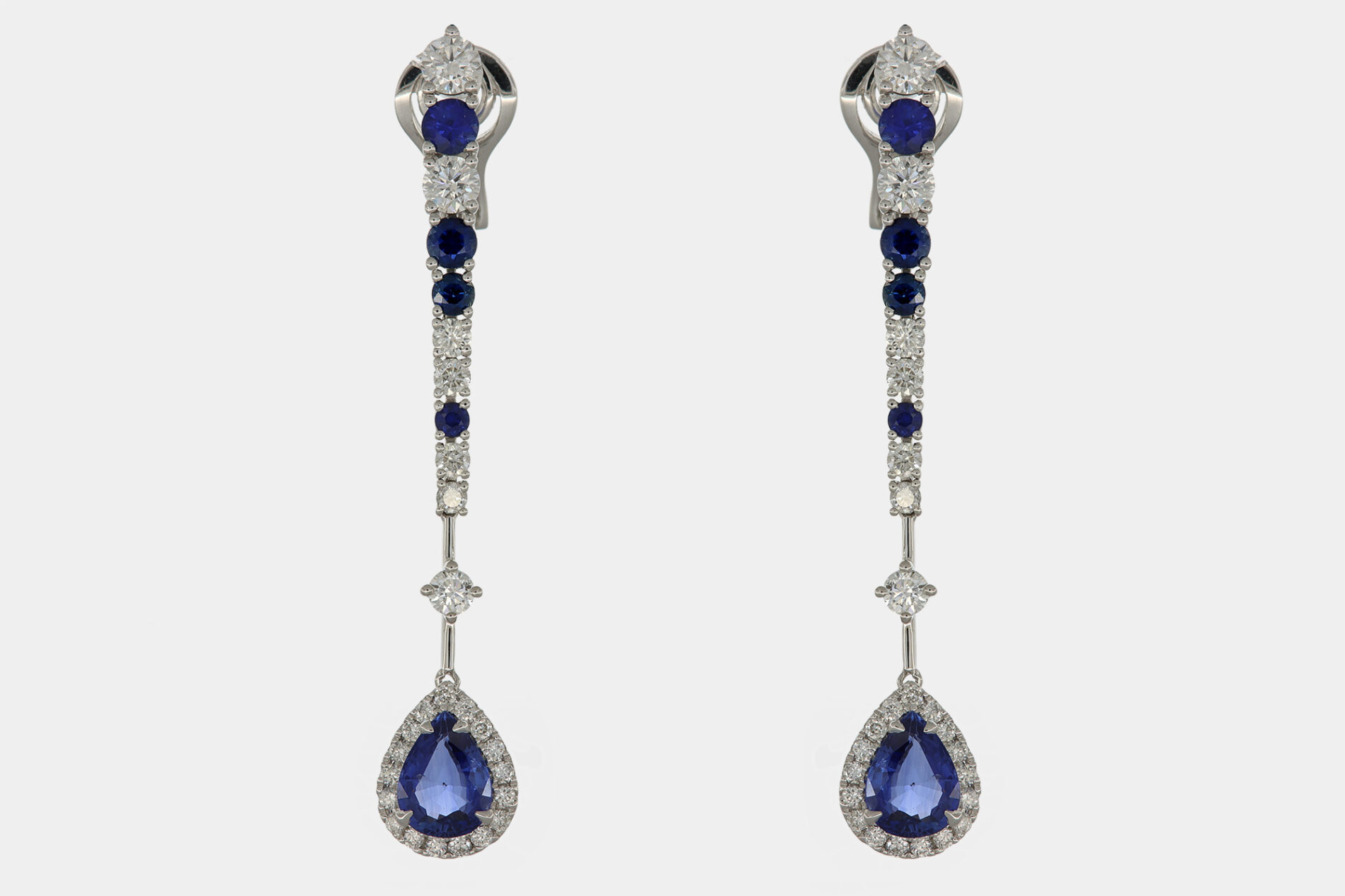 Generalmente questi gioielli si sviluppano tutt’attorno alla pietra centrale, che sia del pendente più “importante” o dell’orecchino stesso. Una pietra taglio goccia, ovviamente. Come nel caso di questi orecchini con pendenti zaffiri goccia Prestige White.