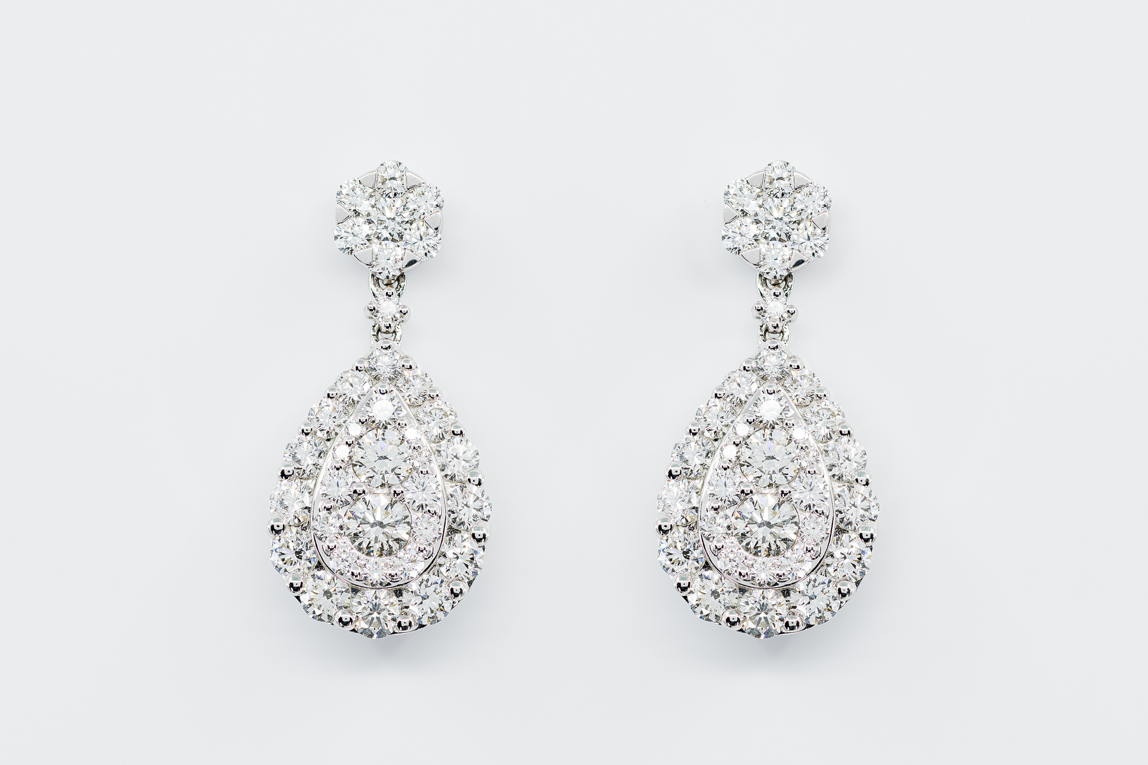 Generalmente, i gioielli a forma di goccia si creano tutt’attorno alla pietra centrale. Una pietra taglio goccia, ovviamente. Ma se il designer è molto bravo, può anche realizzare gioielli di forma usando pietre di taglio diverso. Ed è questo il caso degli orecchini pendente goccia diamanti Prestige.