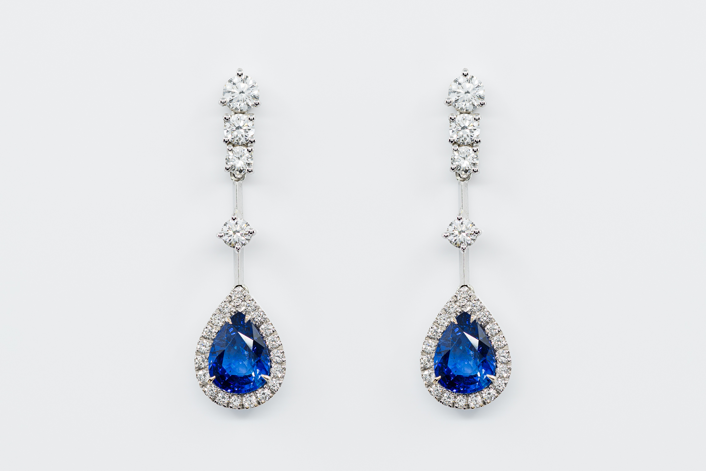 Indovinata al 100% è la scelta degli zaffiri taglio goccia. Se osservate bene gli orecchini, noterete una linea di continuità tra i diamanti sul gambo e gli zaffiri. Se osservati con attenzione, sembra quasi che questi gioielli siano la rappresentazione della pioggia che cade. Un design romantico e molto suggestivo.